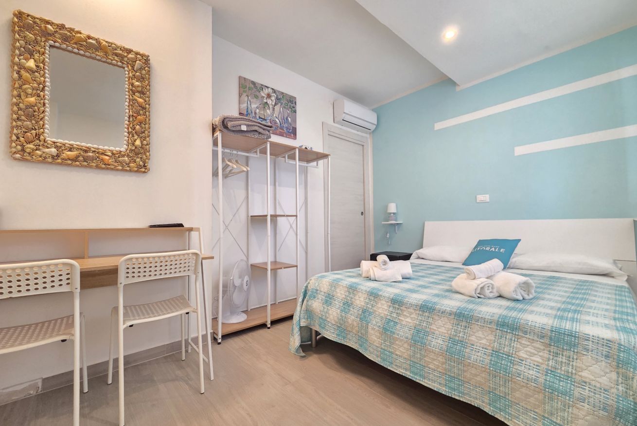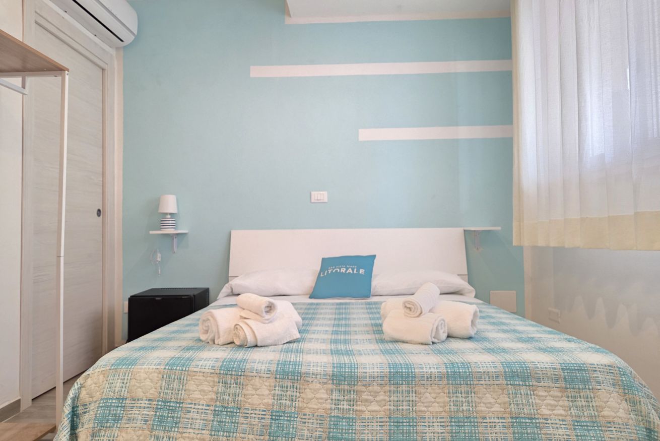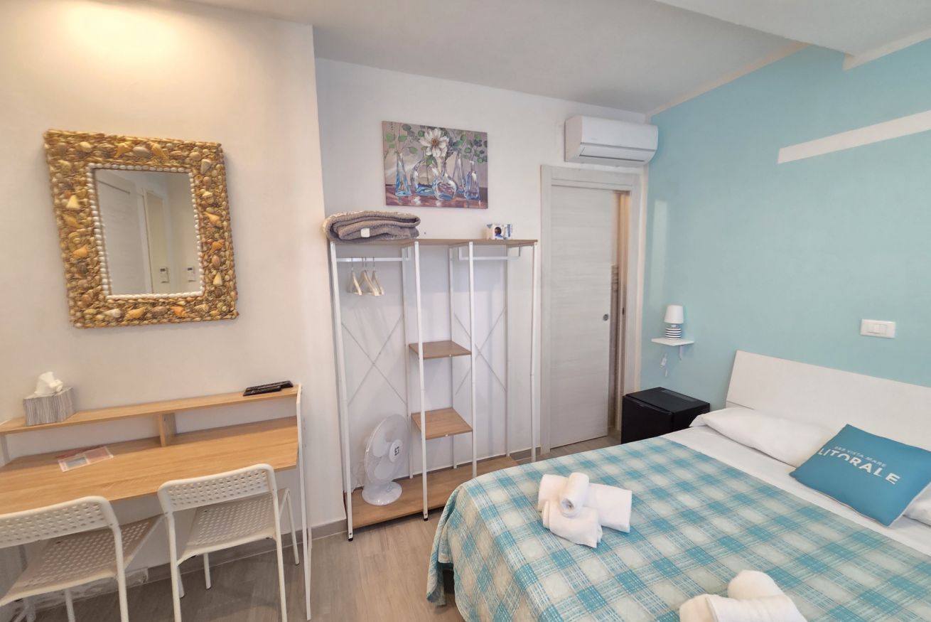 La nostra matrimoniale 'Alba' è dotata di: aria condizionata, riscaldamento, wifi, tv a schermo piatto, minibar, ventilatore, macchinetta del caffè, scrivania, armadio a vista, grucce, tende oscuranti, asciugacapelli, termoarredo, pavimento in gres ed estintore