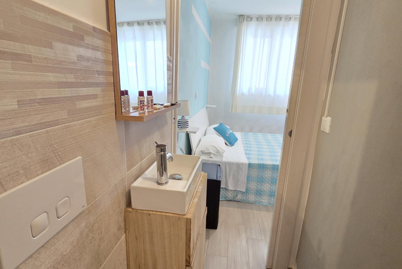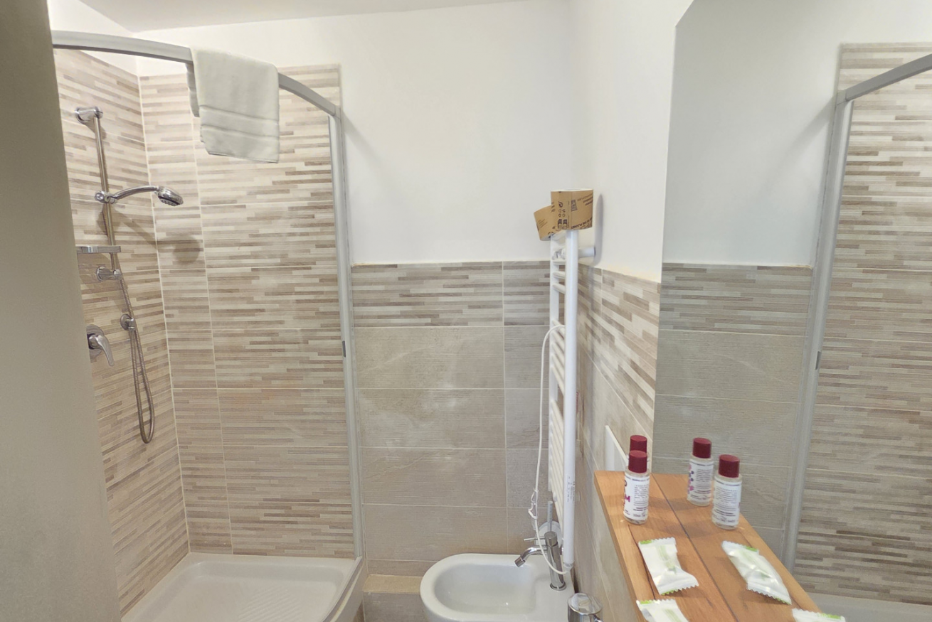 La nostra 'Matrimoniale Classic' di 18 mq è cosi composta: camera con letto matrimoniale e un bagno privato completo non finestrato con cabina doccia.