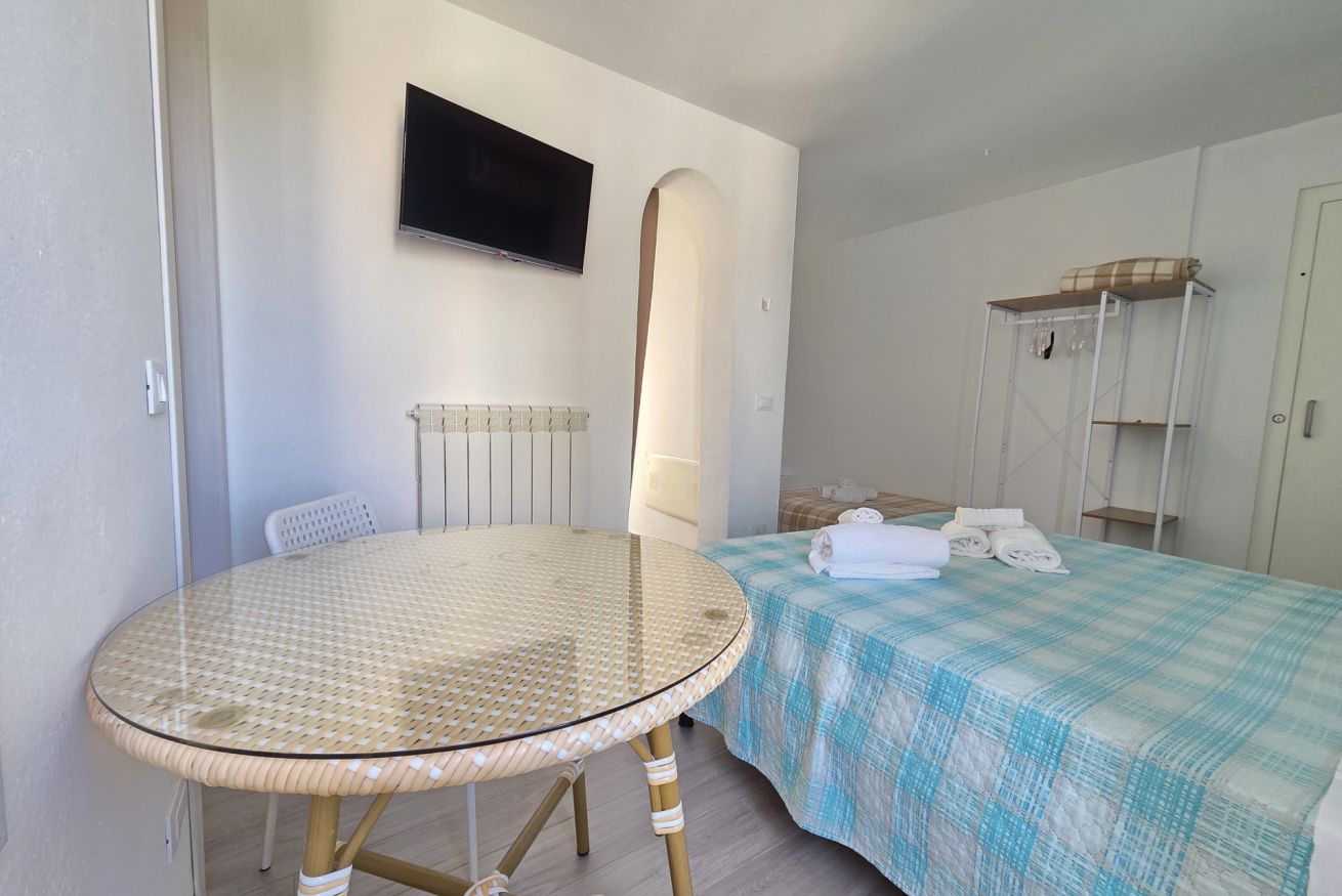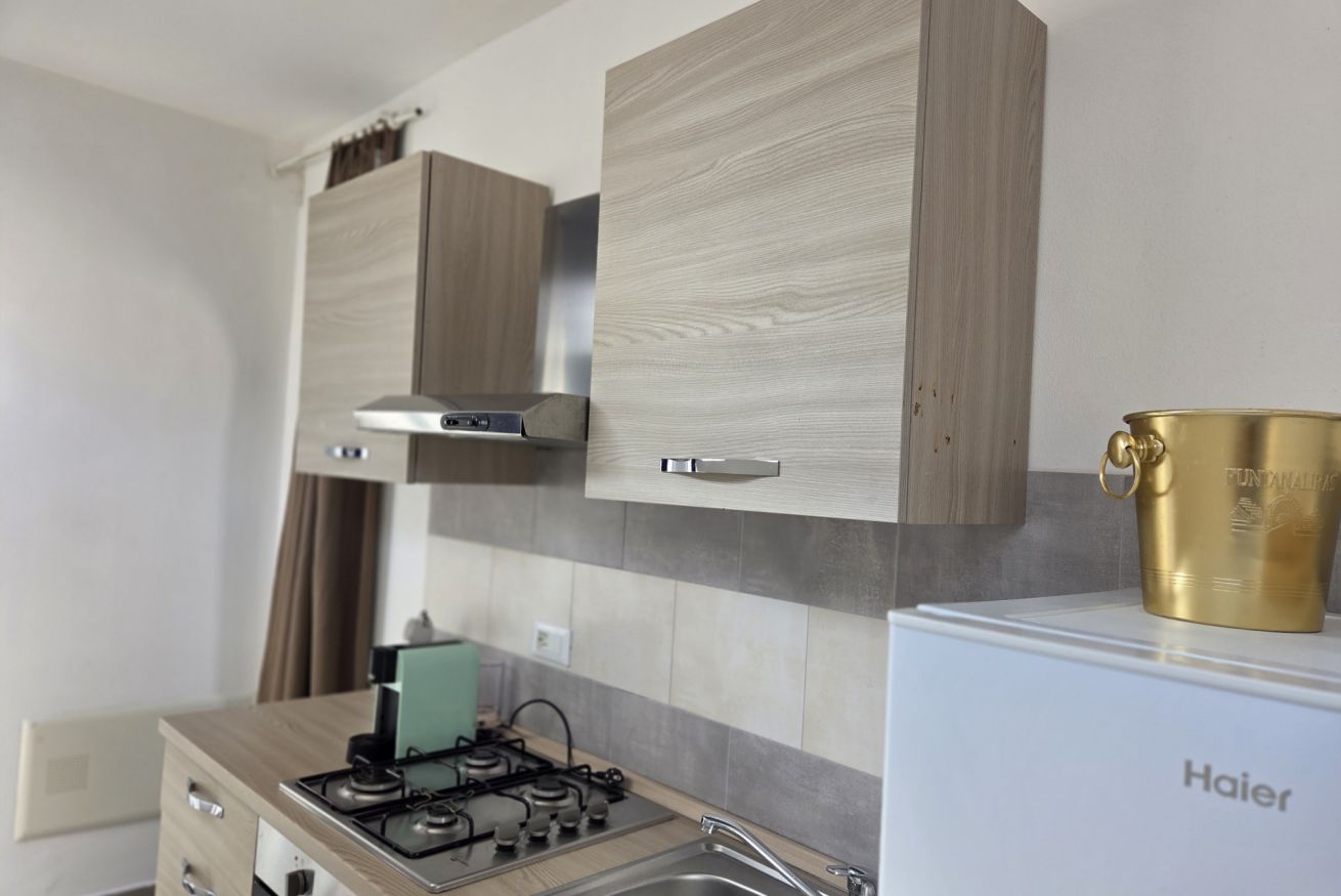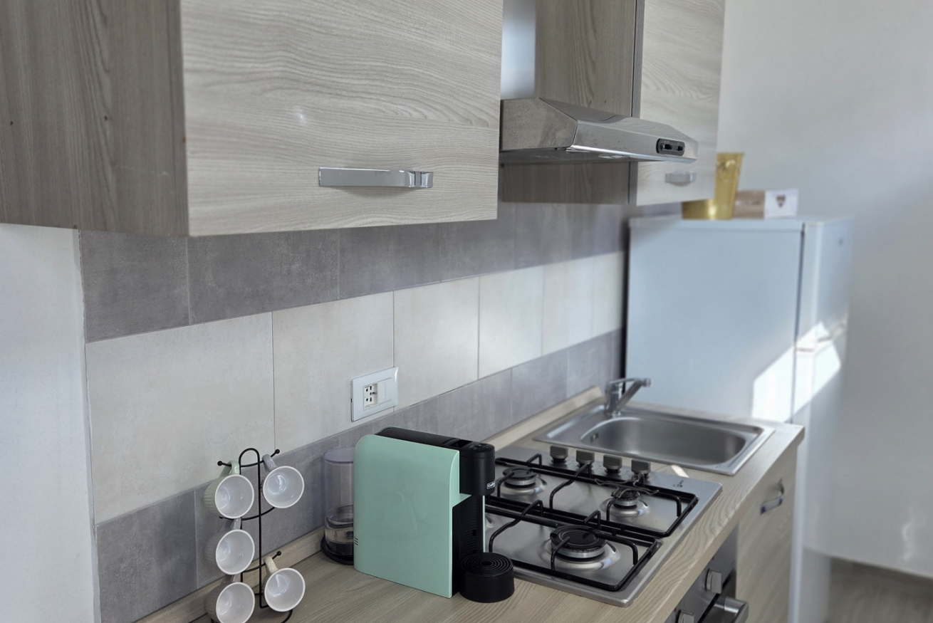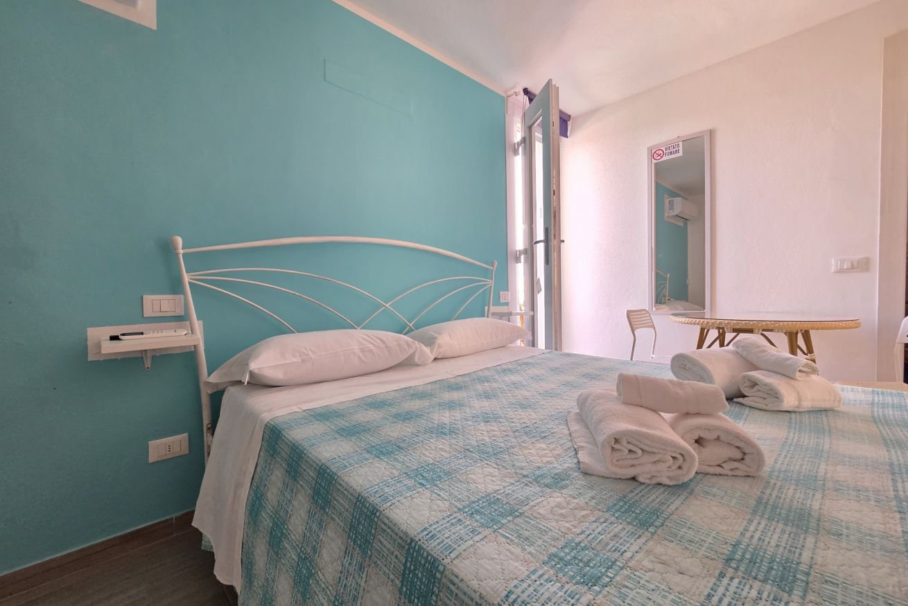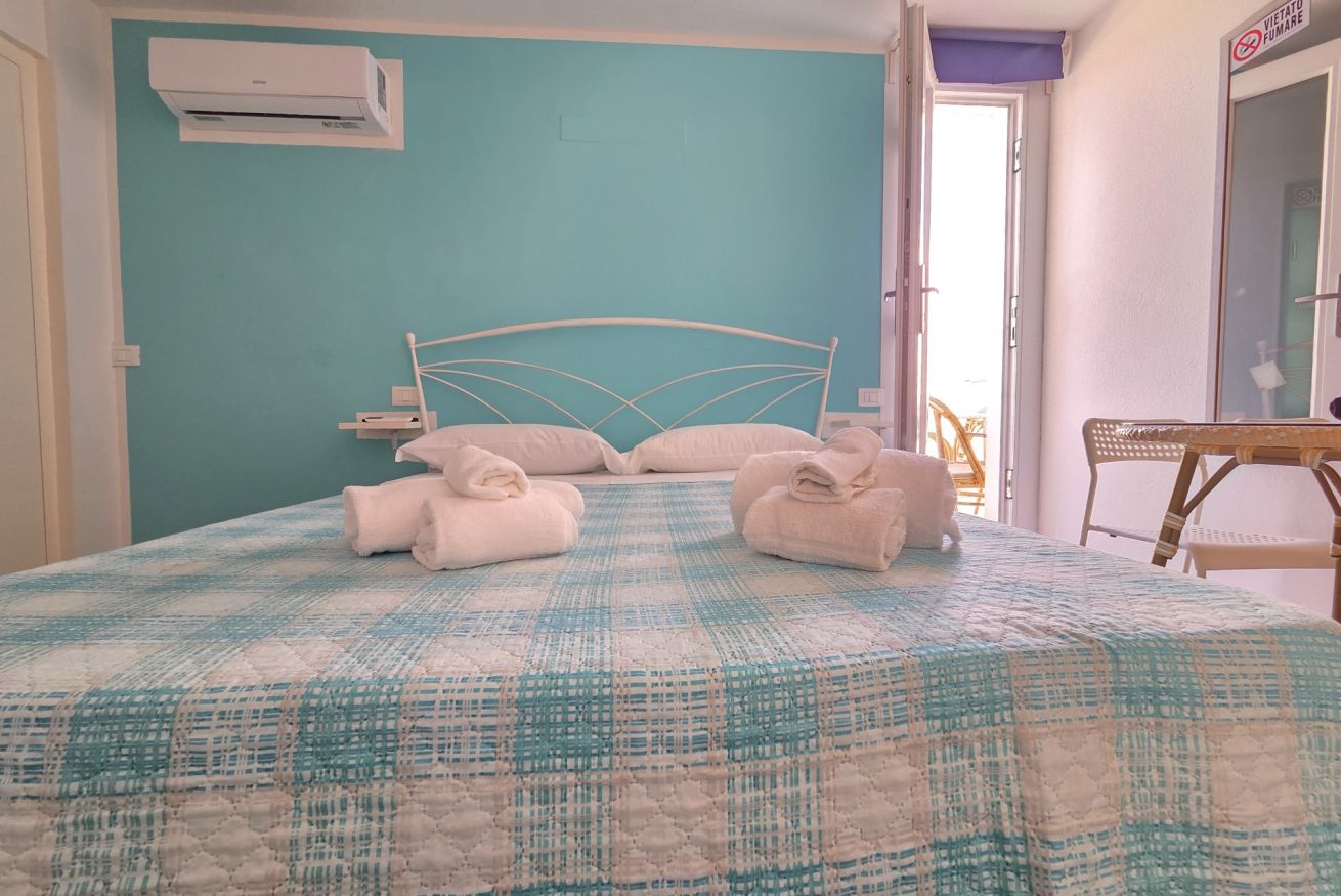 La nostra 'Tripla con Terrazza' di 25 mq è così composta: camera con letto matrimoniale e un letto singolo, angolo cottura dotato di tutti i comfort, bagno privato completo finestrato con cabina doccia e completa l'alloggio un'ampia terrazza privata con vista, attrezzata di tavolo e sedie.